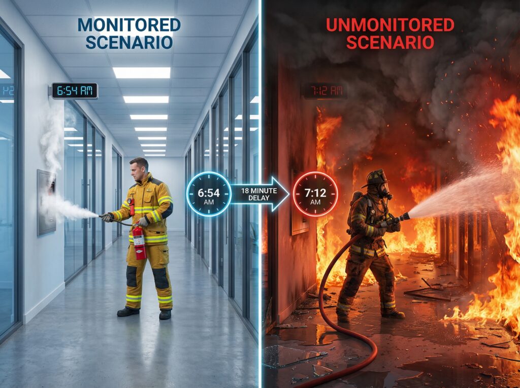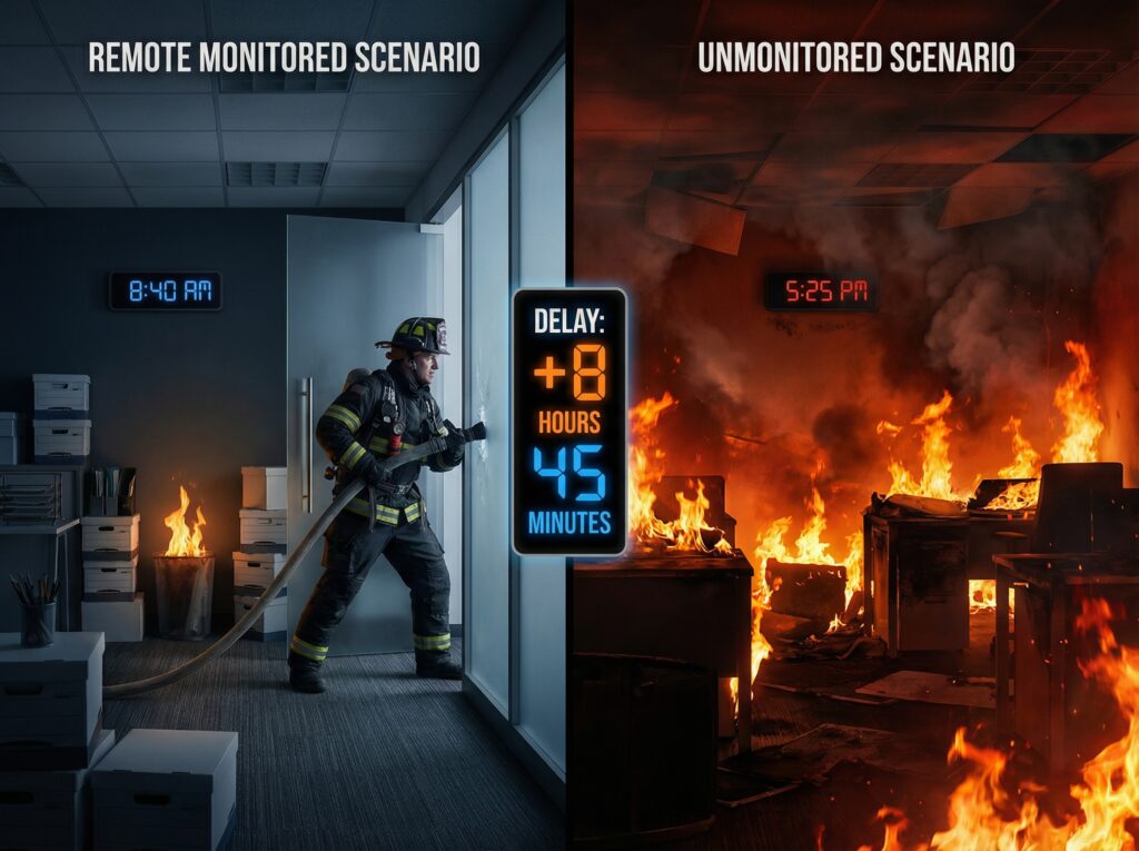 Remote fire alarm monitoring drastically reduces the time gap between fire detection and emergency response. In an unoccupied building scenario, monitoring cut the response time from 17 minutes 25 seconds to 8 minutes 40 seconds—a difference of 8 minutes 45 seconds. This time saving is critical because fire growth is exponential; these minutes can prevent a small fire from progressing to a catastrophic loss, potentially saving hundreds of thousands of dollars in damage.