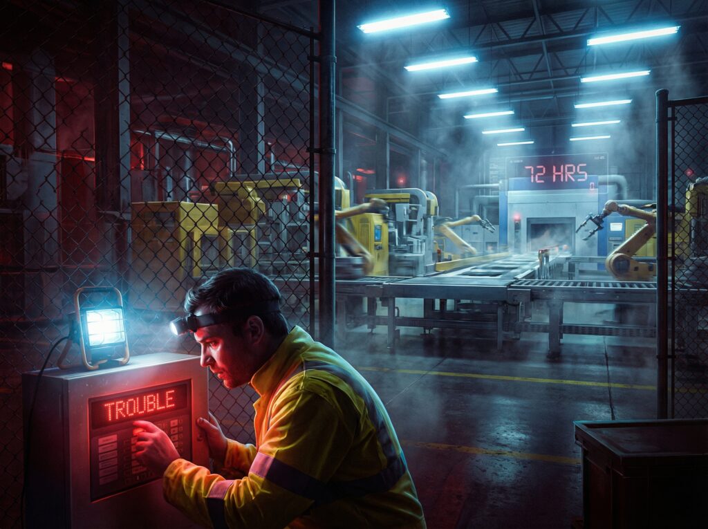 The fire marshal issued a 72-hour notice to cease operations at a precision manufacturing plant due to critical fire alarm deficiencies. The plant faced a $3+ million loss if shut down. The problem included dead batteries, non-functional notification devices, and a failed monitoring connection. An emergency repair crew worked 36 continuous hours to resolve all five critical violations, ensuring the system passed re-inspection and operations continued without interruption. This $20,000 emergency repair prevented a catastrophic $3.18 million loss.