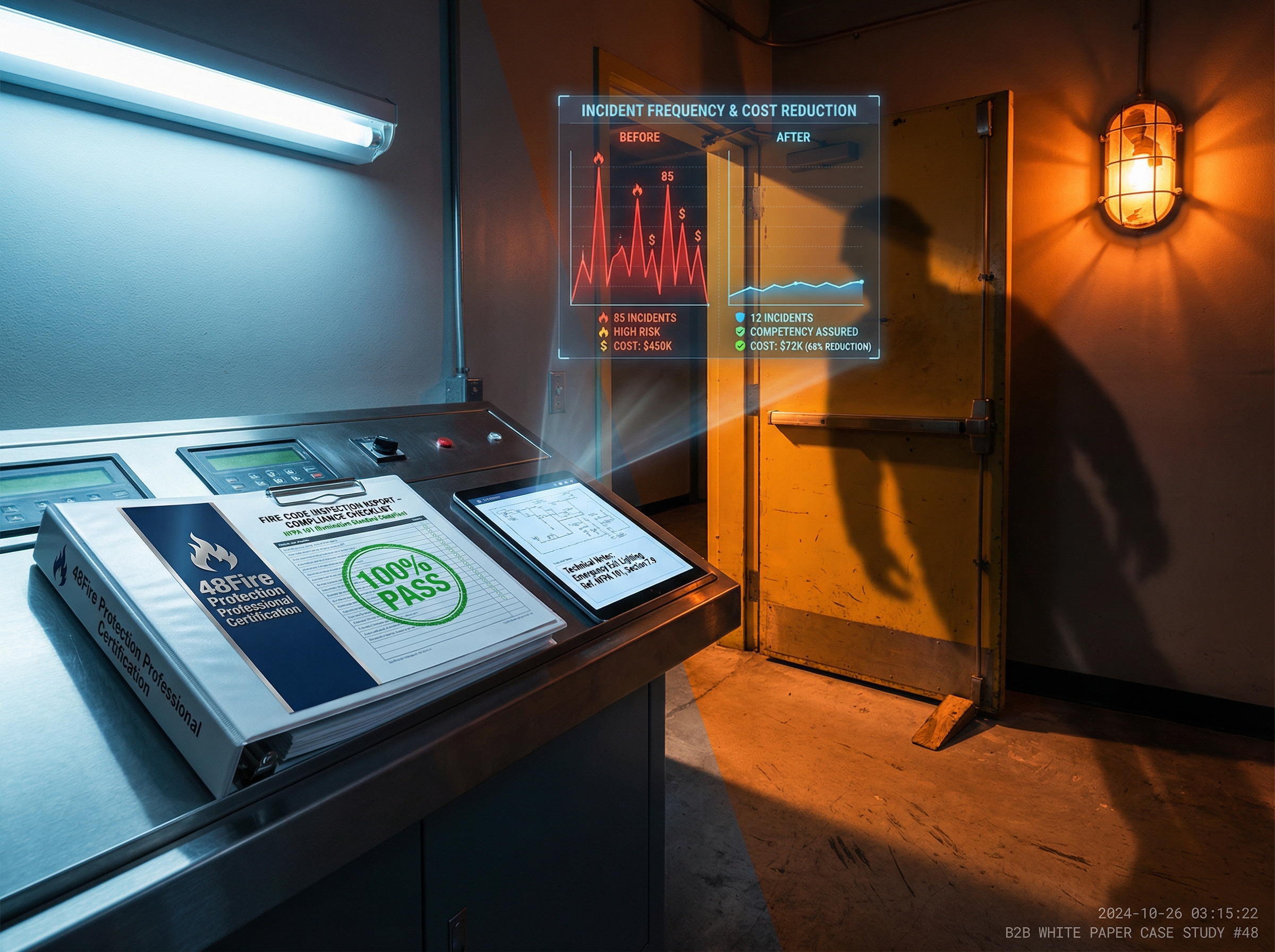 Professional certification creates measurable, sustained safety metrics improvement across multiple dimensions. 8 companies implementing 48Fire Protection certification achieved: 68% incident reduction, 100% inspection pass rate, 67% knowledge improvement, 156% near-miss reporting increase, $18,400 annual insurance savings, 44% faster evacuation performance. Metrics improvement sustained over 24+ months. Certification investment ($12,000-18,000 first year) produces $60,000-91,600 value first year (300-500% ROI). Annual refresher ($3,300-5,200) maintains metrics with $40,000-60,000 annual value (900-1,400% ROI). Professional certification correlates directly to measurable safety improvement.