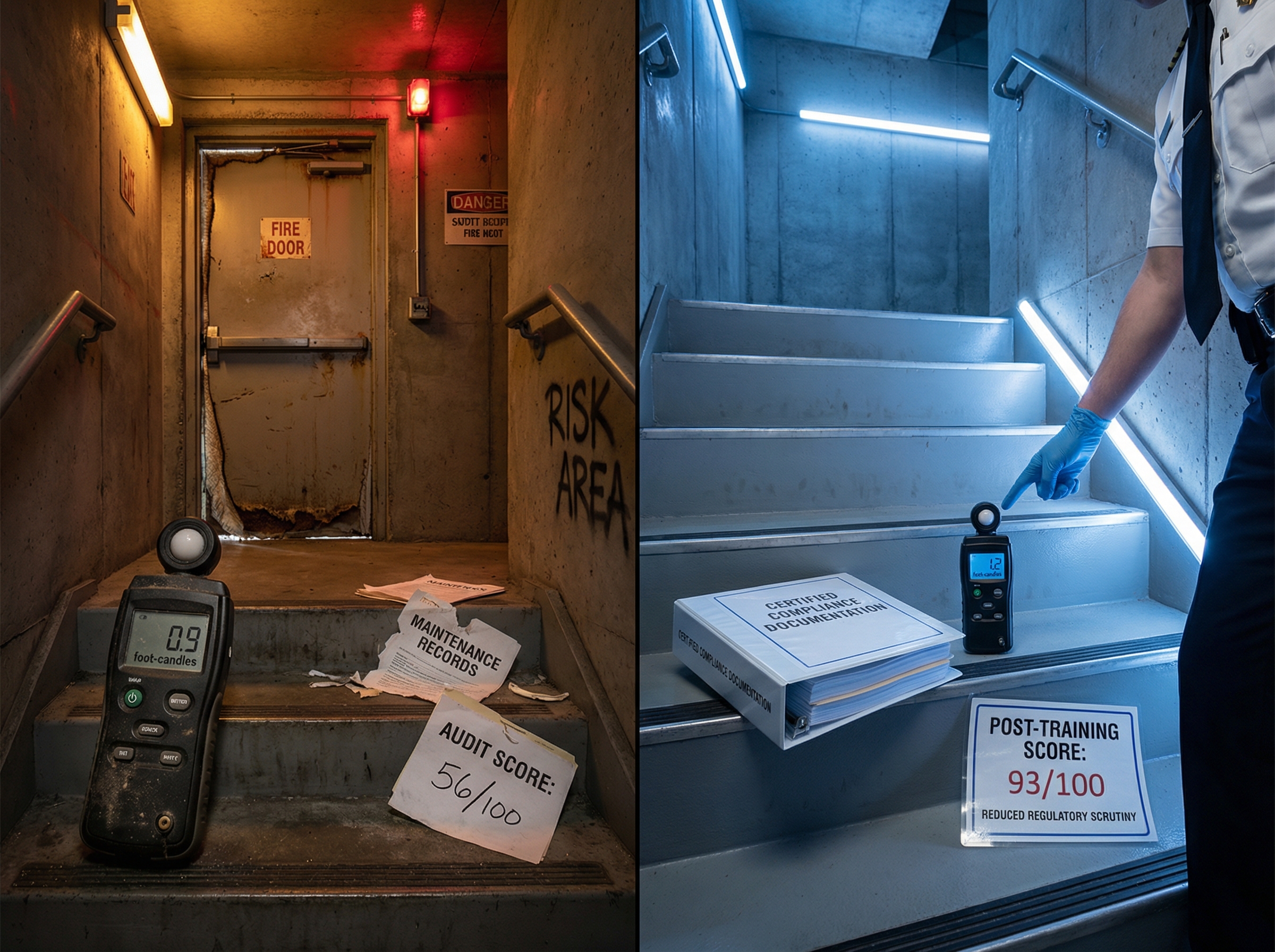 - After: NFPA 101 verified (1.0+ foot-candles), annual load testing confirmed, 90-minute duration verified