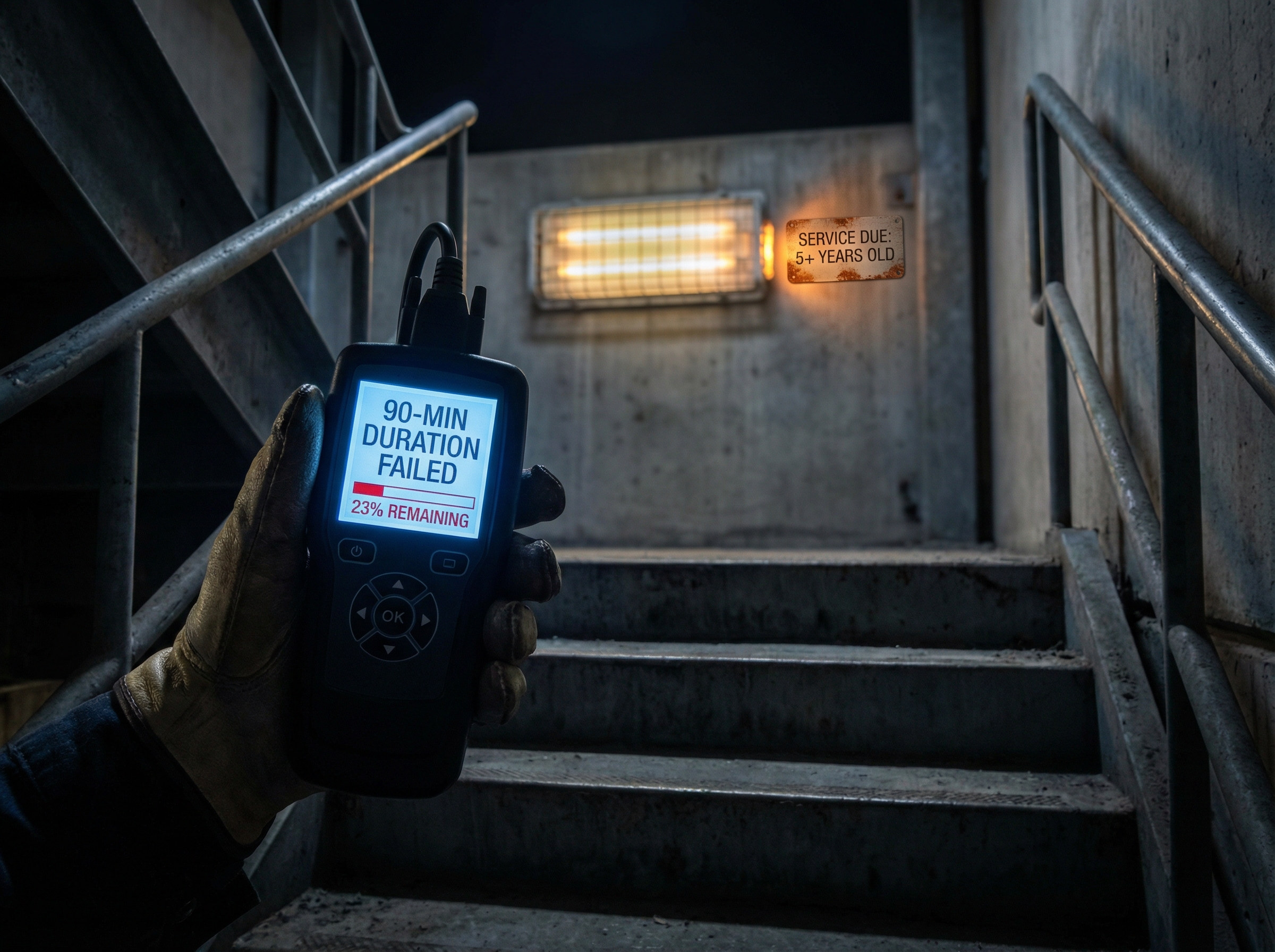 Life safety lighting failures progress through visible warning stages before complete malfunction.