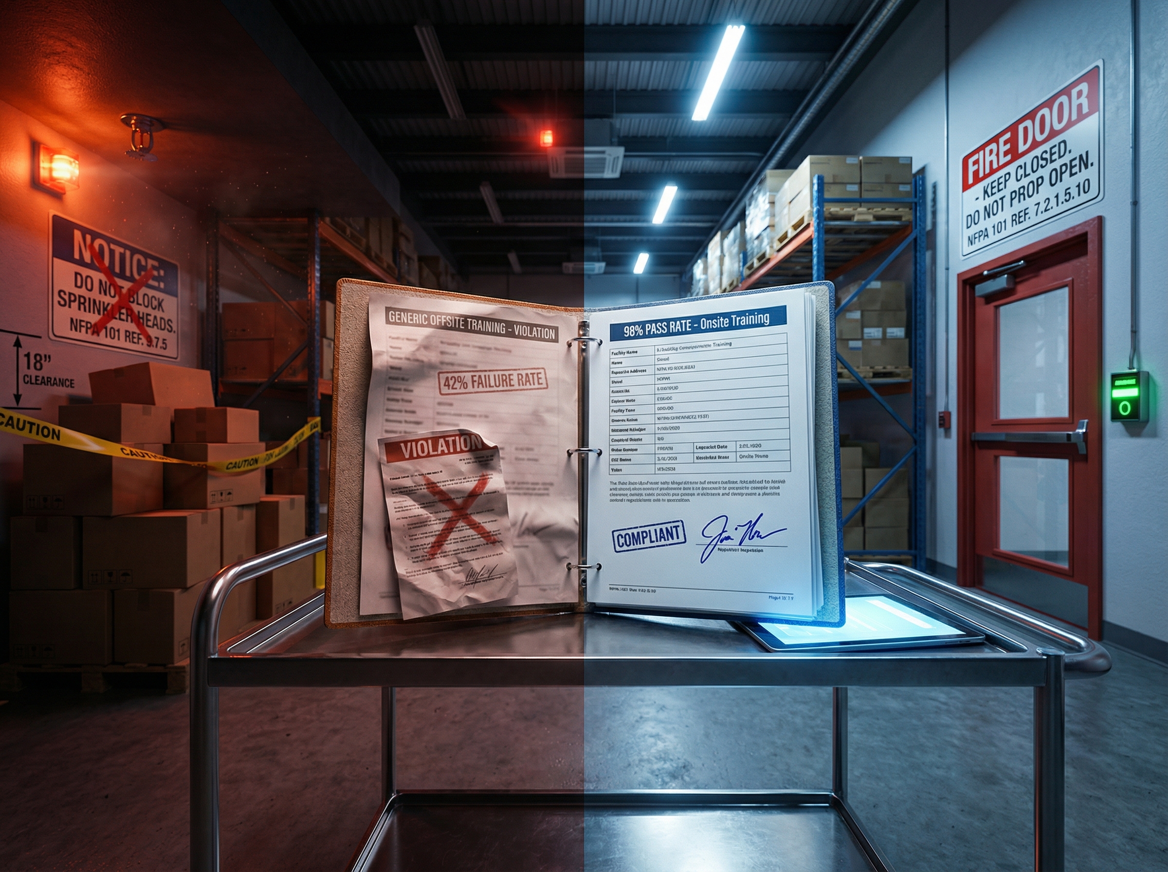 - Documentation includes: “Training conducted at [facility address], facility-specific exit routes covered, emergency lighting specifications for this facility verified (1.2 foot-candles), fire doors at this facility identified”