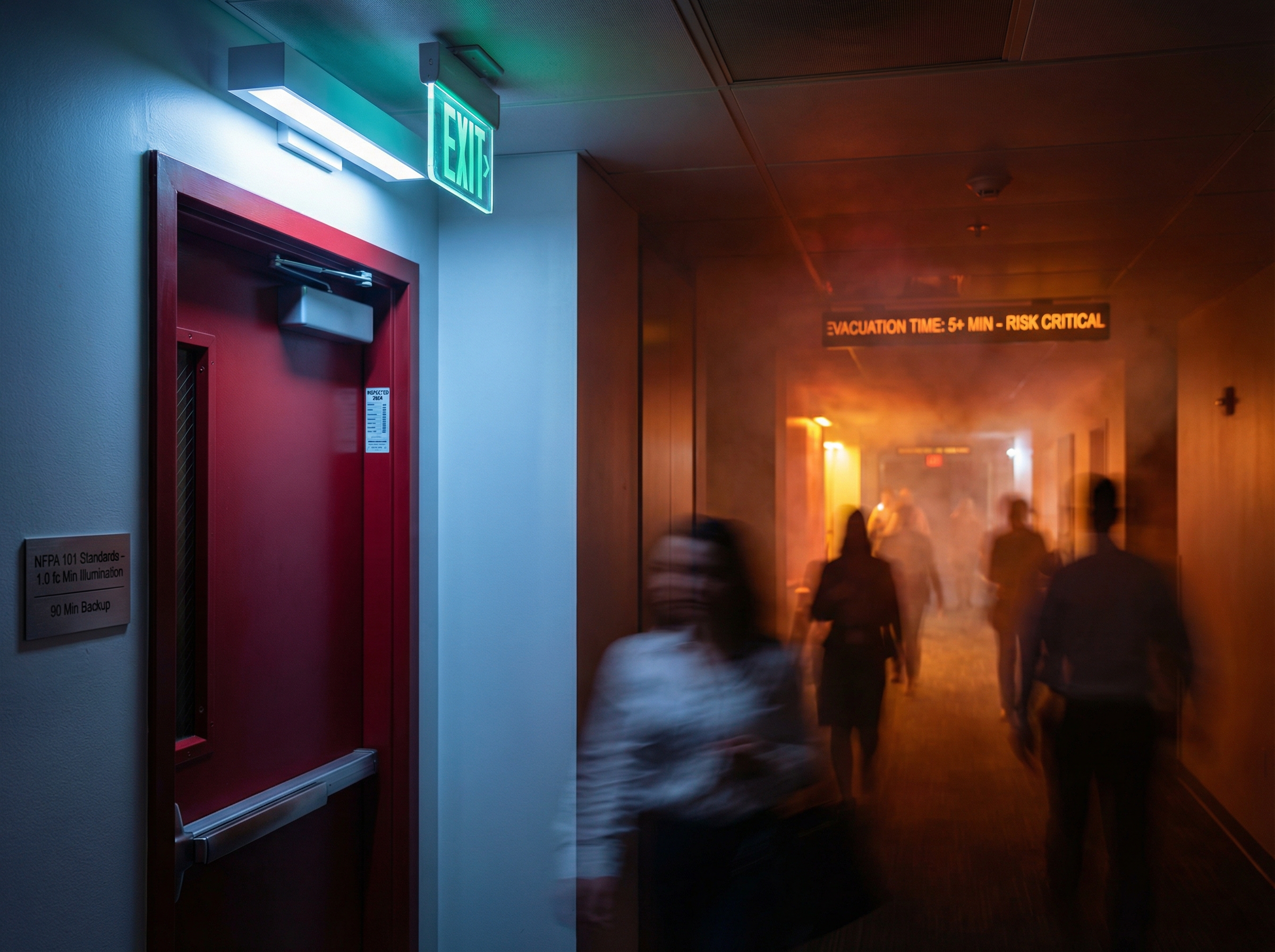Fire doesn’t discriminate by property type. Fire alarm sounds. Evacuation required. Assembly procedures necessary. Emergency lighting (NFPA 101: 1.0+ foot-candles, 90-minute backup) must illuminate exit routes. Fire doors must close properly. Equipment must shut down safely. Communication must function. Accountability must complete. Response required regardless of property type.